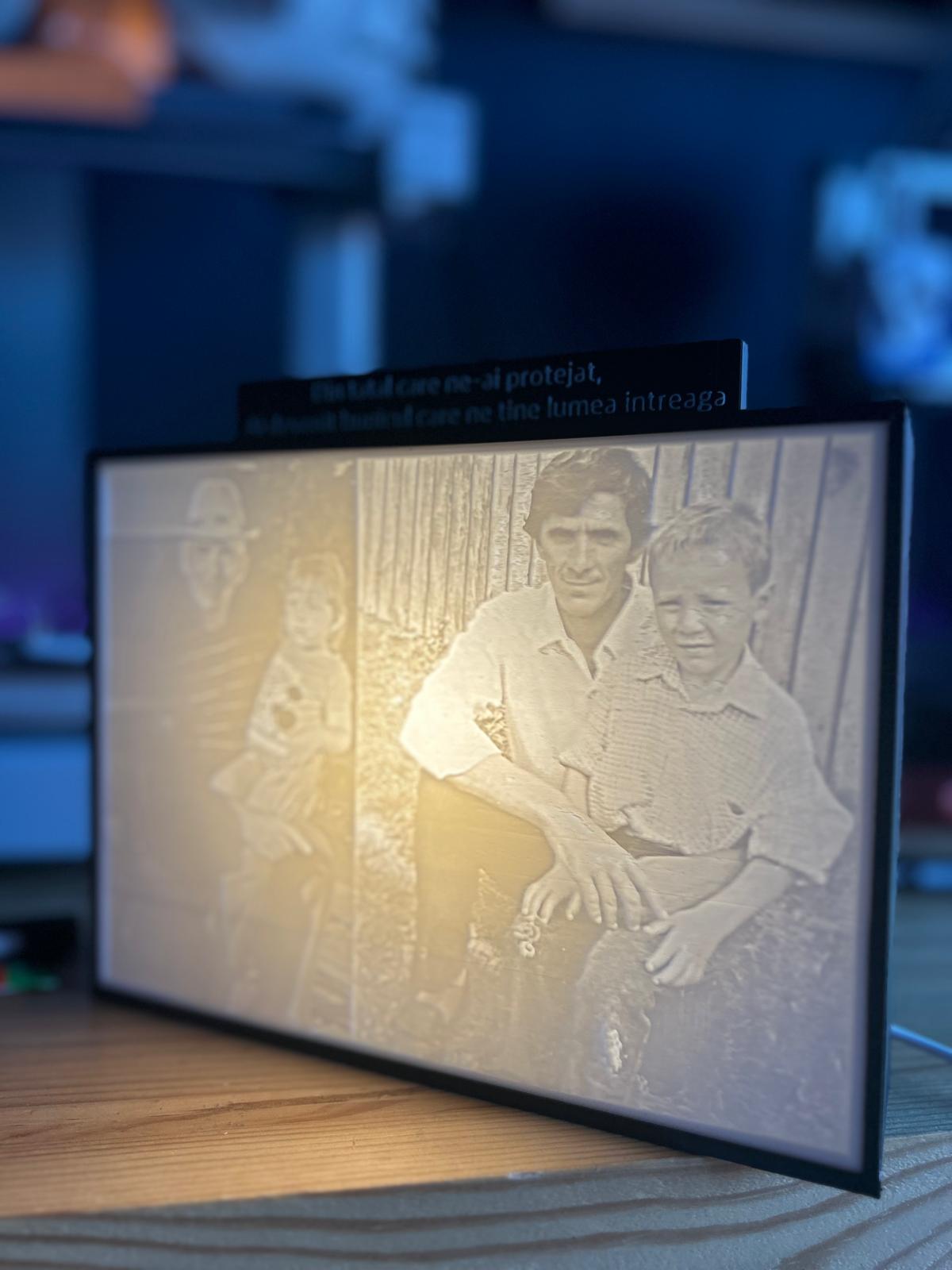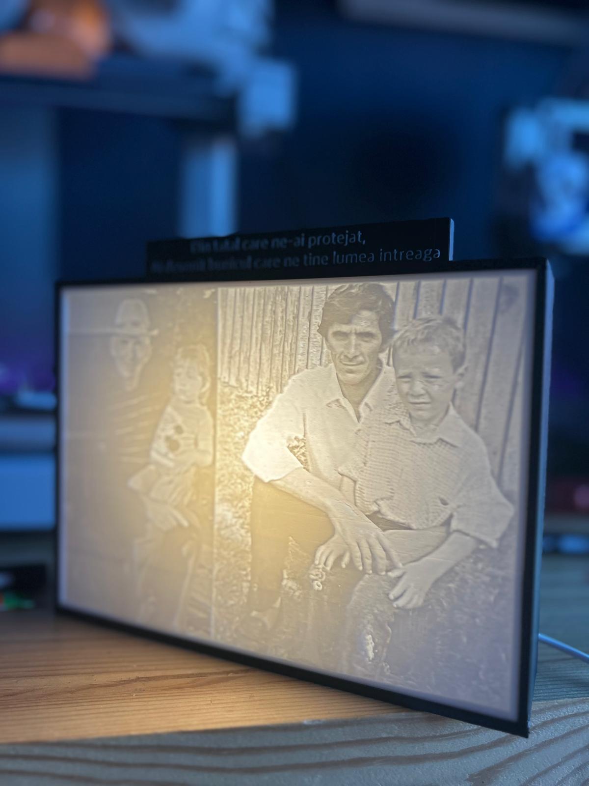Tabloul printat 3D iluminare LED este ideal pentru cadouri personalizate. Poate fi realizat cu poze de familie, portrete, animale, peisaje sau momente speciale. Este potrivit pentru aniversari, sarbatori, decor de camera sau branding personal. Produsul se potriveste in orice locuinta sau birou.